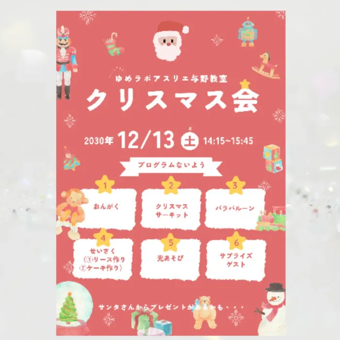 ゆめラボアスリエ与野教室クリスマスイベントのお知らせ|さいたま市浦和区の児童発達支援事業所