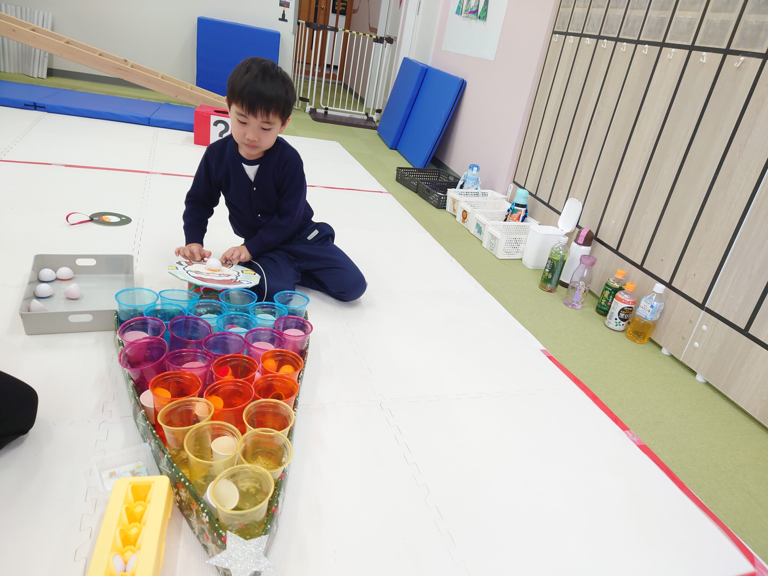 プレゼント運びゲームでは、箱やボールをプレゼントに見立てて、落とさないようにゴールまで運ぶ遊びをしました。慎重にゆっくり運ぶお子さまもいれば、「急いで行ってみる!」とチャレンジするお子さまもいて、それぞれのペースで楽しむ様子が見られました。