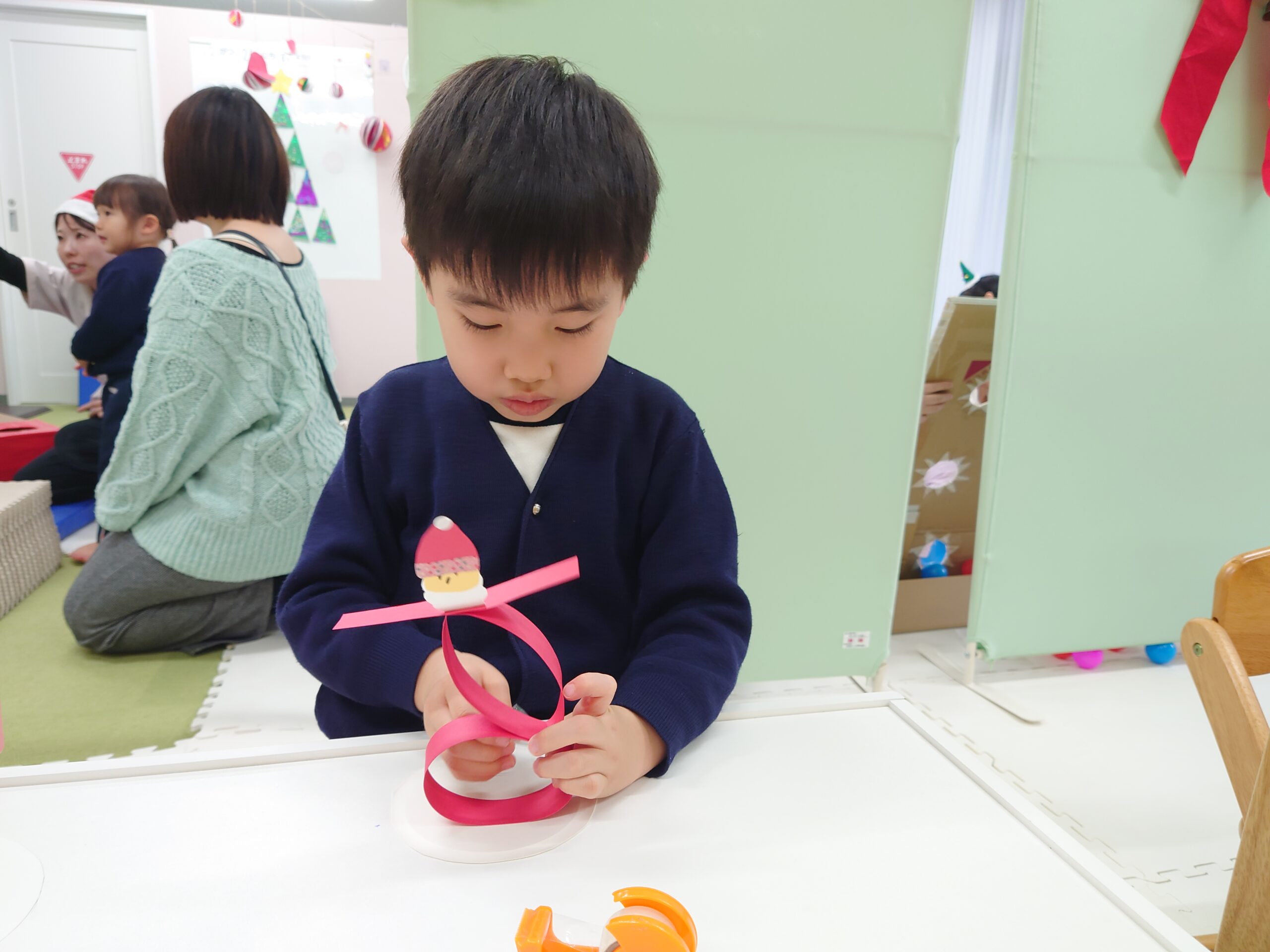 工作コーナーでは、サンタさんをモチーフにした簡単な制作に取り組みました。パーツを貼ったり、ペンで顔を描いたりしながら、「どんなサンタさんにしようかな?」と一人ひとりが自分なりのサンタさんを作りました。