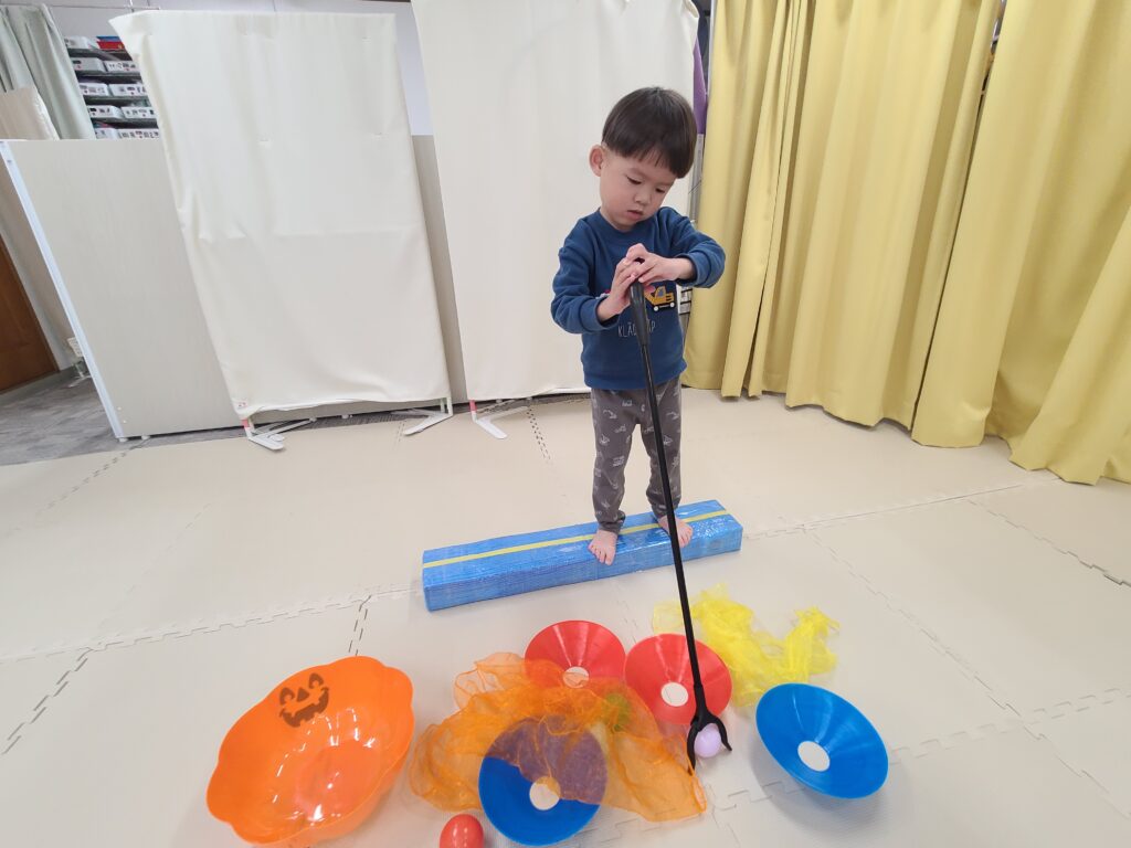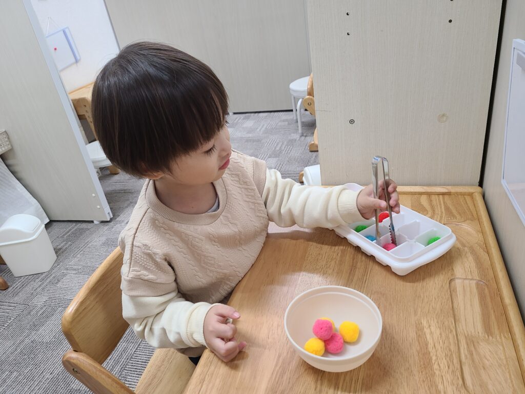 2つ目の人気プログラムは、マジックハンドを使った遊びです。先端でスカーフやカラーボールをつまんだり、かごに入れたりしながら、楽しみながら手先の発達をうながしていきます。1歳のお子さまでも持ちやすいサイズ・重さの道具を選び、「できた!」を感じやすい場面をたくさん作っています。