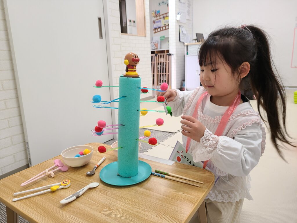 マジックハンドは、腕を伸ばして道具を使う遊びでもあります。そのため、自分のからだの位置や動きを理解するボディイメージを育てる良い機会となります。「腕を伸ばしたら届く」「少し遠いからもう一歩近づこう」など、からだと空間の関係を体感しながら遊ぶことができます。